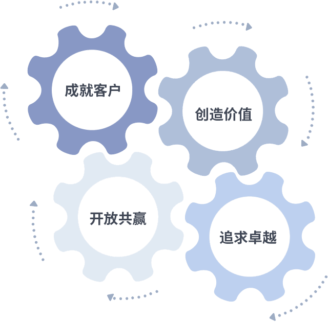 成就客户是一切决策的出发点,,,,创造价值是衡量所有工作的标准,,追求卓越是我们做事做人的态度,,,开放共赢是我们的格局也是最终的结果。。价值观的齿轮环环相扣,,,推动着组织里的每个人不断向前。。。。