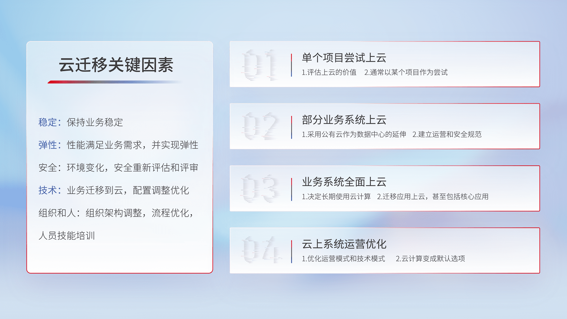 结合实际业务,,从规划设计、、、云平台选型、、、云原生改造、、数据迁移、、、、集成交付,,,,迁移全过程为客户识别最佳上云路径,,做好风险识别管理,,,,设计网络架构、、、身份权限、、、、安全审计合规、、、、操作审计、、日志审计、、监控告警策略、、多站点容灾设计等,,,,对云上基础设施进行整体规划,,,提升IT治理水平,,以满足弹性、、、、高可用、、、高性能的需求。。。
