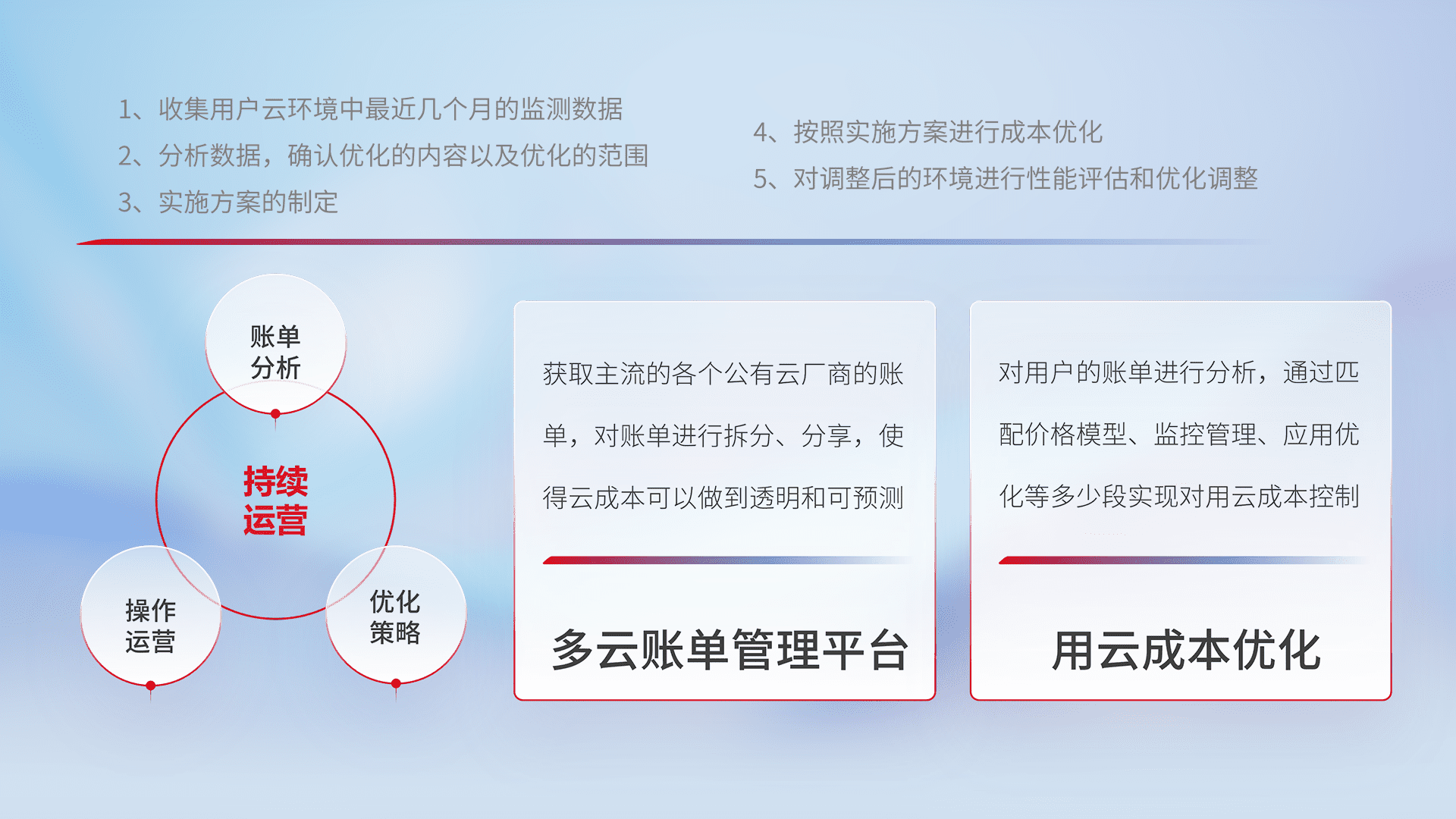 通过多云纳管,,,以统一的资源数据模型把客户的云资源进行抽象和封装,,,,进而实现对多云资源的统一操作,,,,保障云资源管理的可靠性、、稳定性与可用性。。量身定制化运维内容,,,,配置、、、、开发运维、、、补丁管理、、、备份、、、监控、、、、认证和访问管理、、、、审计和日常巡检等,,,保障在用云过程中的可靠度,,,稳定度以及高可用率。。。