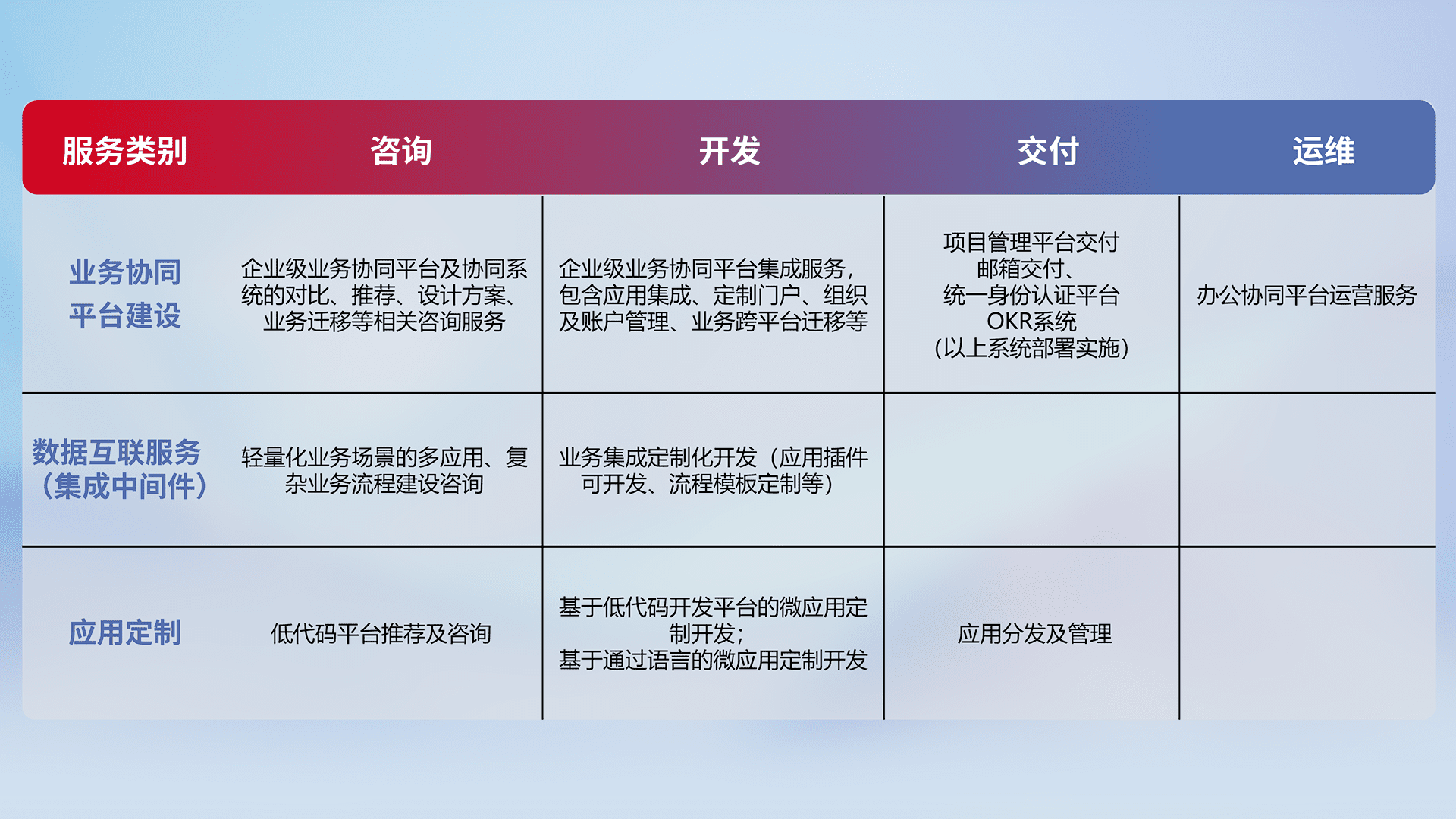 针对钉钉、、企微、、IDaas等平台级产品提供产品的规划、、、方案、、、交付、、、定制化开发等服务,,实现如统一协同办公、、、、智能客户服务、、、、混合会议管理、、智能数据查询、、、、等业务场景,,,实现数字化转型。。。